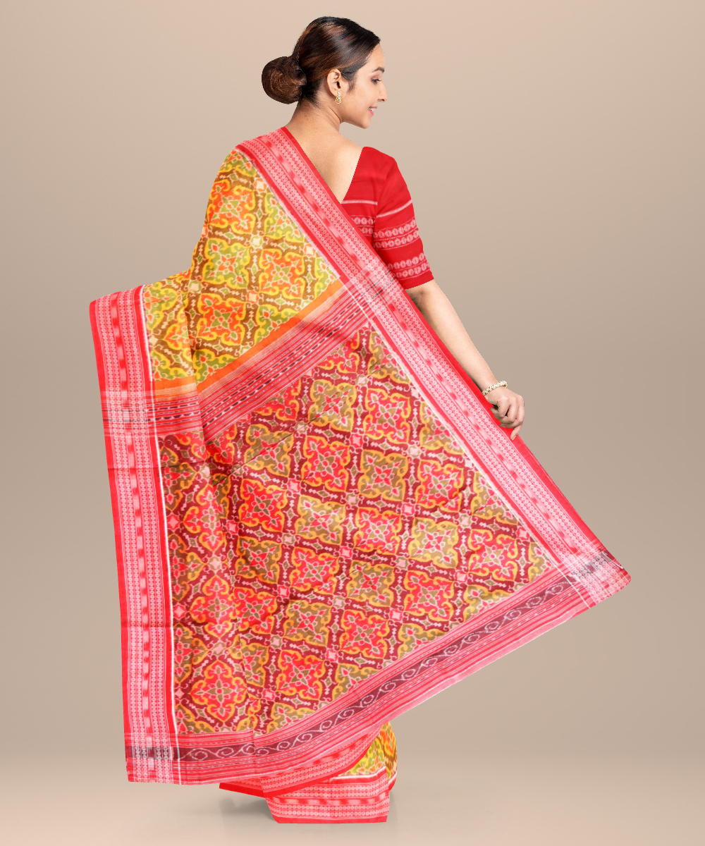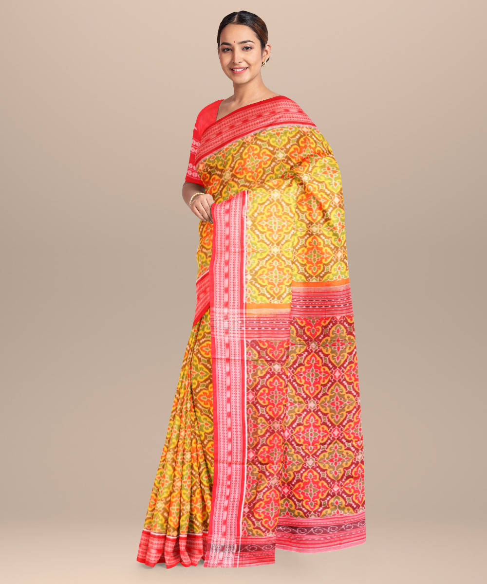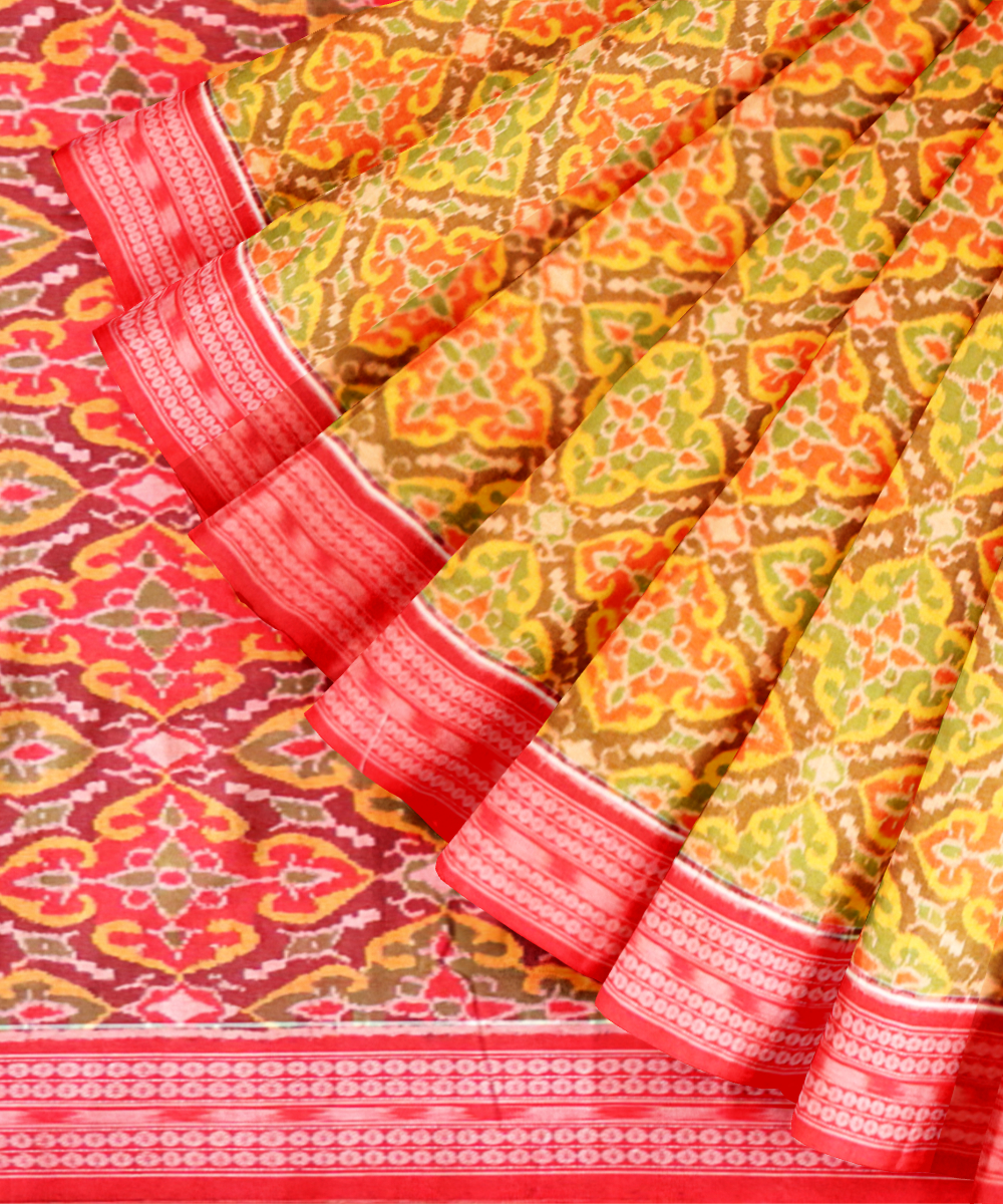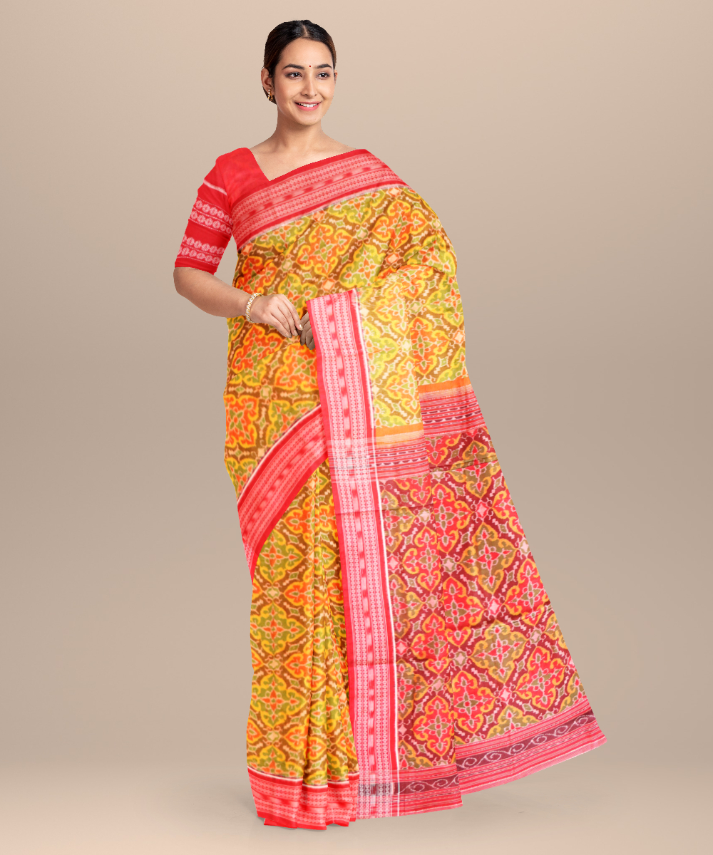 The sambalpuri weave is a bandha or ikat yarn tie dye textile of Odisha which is most popular for its culturally significant motifs inspired by the locals. These sarees come to you directly from the western clusters of Odisha at Bargarh, Barpali, and Sonepur. Each motif is designed symbolically derived from mythology, the coastal environment and the contexts of marriage and worship that is strongly believed in this part of the country. You can pick out your favourites from conch shell, fish, deer, butterfly, elephant, stars and many more iconic motifs beautifully woven on each of these sarees.