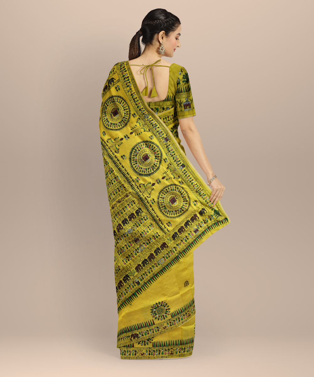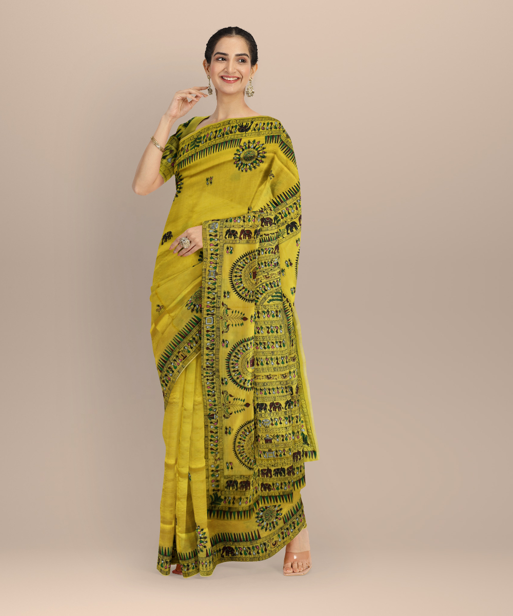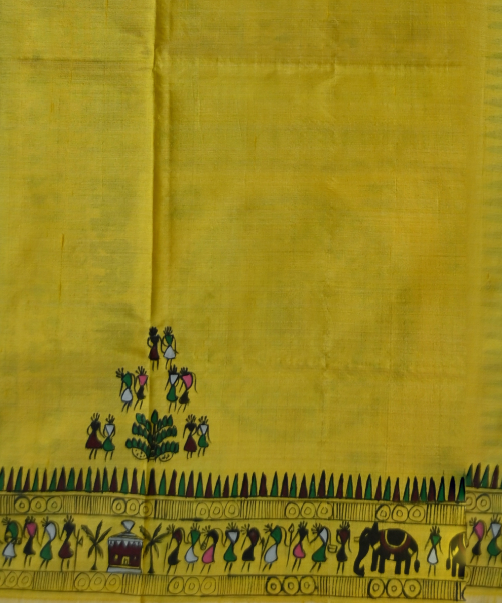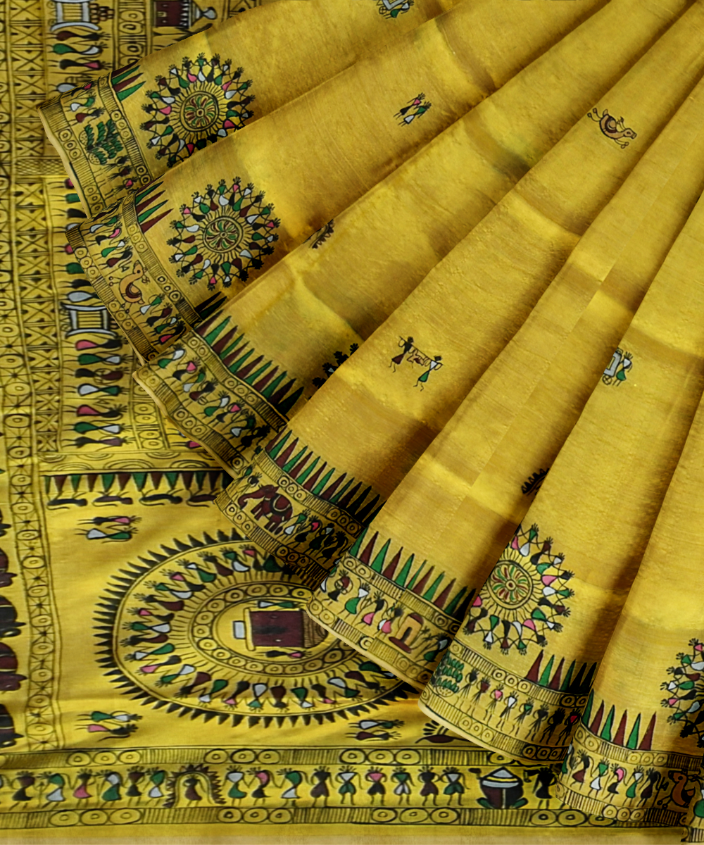 • Length x Width: 6.2 x 1.18 meters (46 inches) • Material: Silk • Warp x Weft : Fine Tussar silk x Fine Tussar silk • Blouse piece: Available bull; Colour hues may slightly vary from that which appears in the image bull; Minor irregularities is the uniqueness of handlooms and makes each piece exquisite bull; Photo credits and appreciation goes to our vendor who have shot the images themselves